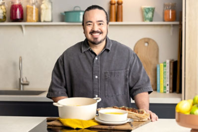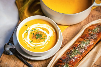 Scoop the seeds from the pumpkin and discard. Scoop the flesh from the pumpkin and sweet potato (or leave the skins of either or both on if you prefer) into the pot. Add remaining vegetables, turmeric, stock powder and one litre of water and bring to a simmer. After 10 minutes, blend with a stick blender.