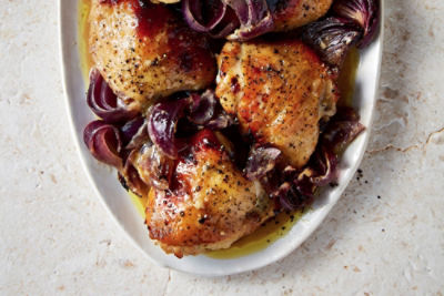 Heat your oven to 200°C (fan-forced) and line a roasting tin with baking paper. Toss the onion in the oil in a large bowl and arrange in the prepared tin, leaving any remaining oil in the bowl. Add the honey, mustard, vinegar, salt and thyme to the bowl and mix to combine. Roll the chicken thighs through the mixture and place in the roasting tin with the onions. Pour in remaining mixture, season with black pepper and roast in the oven for 45 minutes. Allow to stand for five minutes then serve.