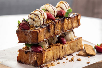 To serve, place one piece of toasted bread on a plate. Top with half the ice cream, strawberries and biscuits. Drizzle with half the chocolate topping and extra honey. Top with remaining bread and ice cream, plus strawberries, biscuits, chocolate topping and honey. Serve immediately.