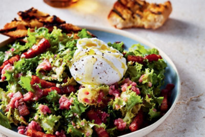 Divide lettuce between serving plates and scatter with the bacon. Top each with a poached egg and serve with a piece of baguette.