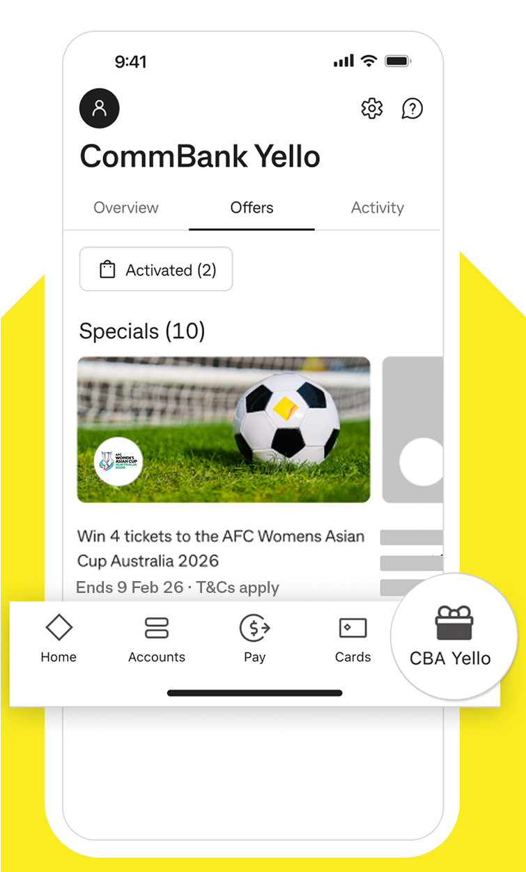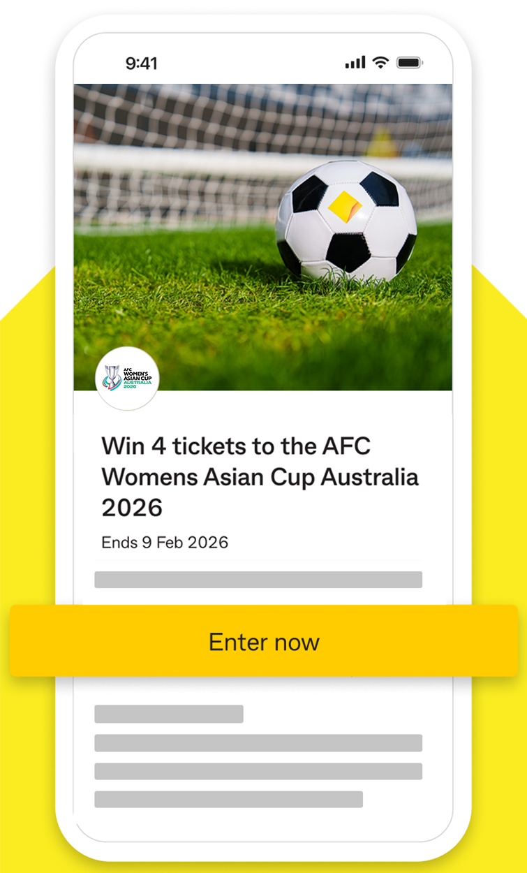 'CommBank Yello x AFC Ticket Giveaway 2026 Competition' (Promotion) is conducted by Commonwealth Bank of Australia (Promoter) and runs from 2:00pm (AEDT) on 13 January 2026 to 3:00pm (AEDT) on 9 February 2026 (Promotion Period) (see full terms and conditions here commbank.com.au/AFCticketgiveaway2026). Open to individuals who are 18 years or over, reside in New South Wales (NSW), Queensland (QLD) or Western Australia (WA), are eligible to participate in CommBank Yello program (see commbank.com.au/commbankyellotcs) (and have not become ineligible or opted out during the Promotion Period), meet the eligibility criteria for either the 'CommBank Yello Plus', 'CommBank Yello Gold' or 'CommBank Yello Diamond' tiers as set out in the CommBank Yello Terms and Conditions, have downloaded and/or logged into CommBank app during the Promotion Period, have a correct email address recorded with the Promoter and are not involved in the Promotion or management of the Promoter or any other benefitting organisation. Entry through the CommBank app during Promotion Period. Max 1 entry and 1 prize per person. First twelve (12) eligible entries randomly drawn in each of New South Wales, Western Australia and Queensland will win 4 x general admission tickets to an AFC Women’s Asian Cup Australia 2026™ match in their state of residence (valued at $170.00). Winners who are NSW residents will win tickets to China PR v Bangladesh at Western Sydney Stadium on 3 March 2026. Winners who are WA residents will win tickets to Japan v Chinese Taipei at Perth Rectangular Stadium on 4 March 2026. Winners who are QLD residents will win tickets to Philippines v Korea Republic at Gold Coast Stadium on 5 March 2026. Total prize value: $6,120.00. Random electronic prize draw conducted at 11:00am on 12 February 2026 at Trade Promotions and Lotteries Pty Ltd (ACN 601 297 330), Level 2, 11 York St, Sydney NSW 2000. Winners notified by email on 13 February 2026. Each winner's first initial, last name and postcode will be published on the Promoter's website on 13 February 2026. Prizes which are unclaimed or which cannot be delivered to or accepted by a winner by 2:00pm (AEDT) on 23 February 2026 will be forfeited and awarded to reserve winners.