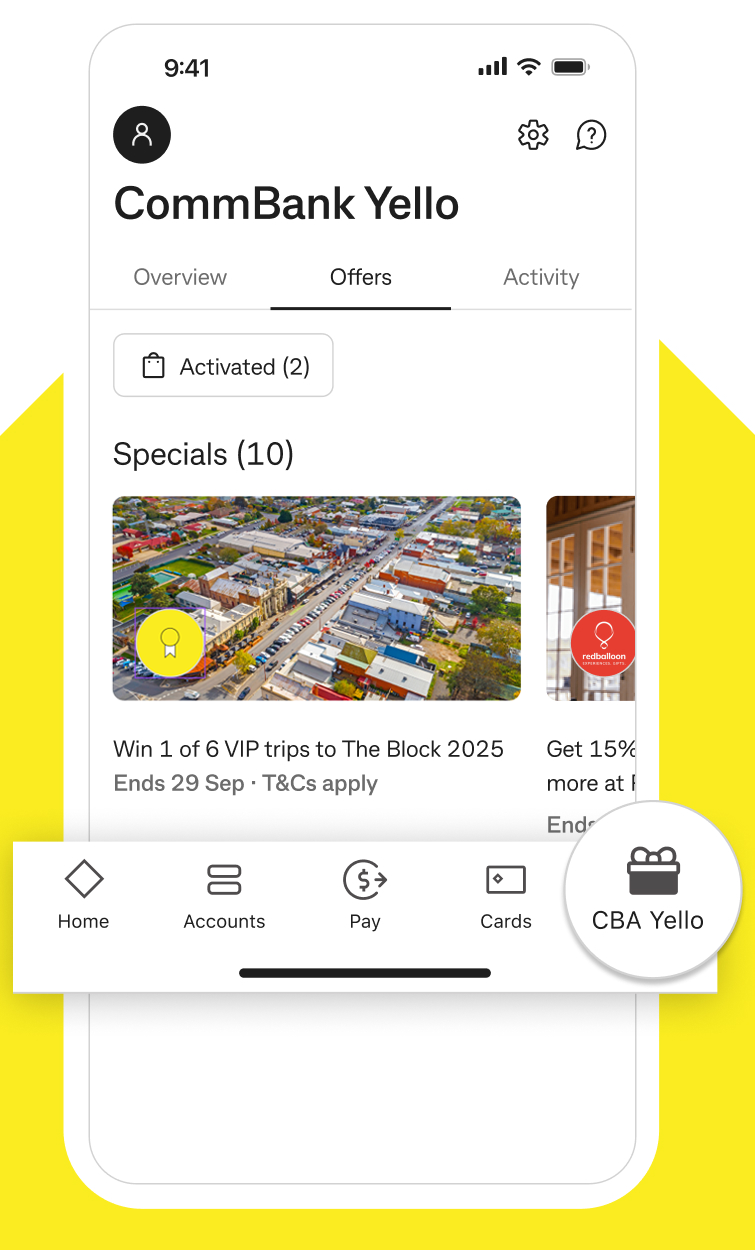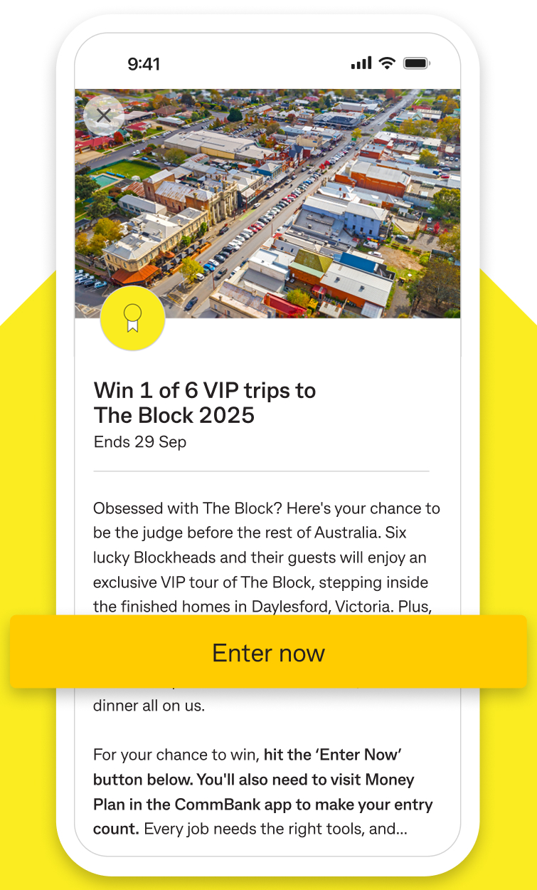 'CommBank Yello x The Block 2025 Competition' (Promotion) is conducted by Commonwealth Bank of Australia (Promoter) and runs from 2:00pm (AEST) on 8th September 2025 to 3:00pm (AEST) on 29th September 2025 (Promotion Period) (see full terms and conditions here commbank.com.au/theblockcompetition). Open to individuals who are 18 years or over, reside in any Australian state or territory (except South Australia), are eligible to participate in CommBank Yello program (see commbank.com.au/commbankyellotcs) (and have not become ineligible or opted out during the Promotion Period), meet the eligibility criteria for either the 'CommBank Yello Plus', 'CommBank Yello Gold' or 'CommBank Yello Diamond' tiers as set out in the CommBank Yello Terms and Conditions, have downloaded and/or logged into CommBank app during the Promotion Period, have a correct email address recorded with the Promoter and are not involved in the Promotion or management of the Promoter or any other benefitting organisation. Entry through the CommBank App during Promotion Period. Max 1 entry and 1 prize per person. First 6 eligible entries randomly drawn will win the following prize for 2 people: return economy class flights from winner's nearest airport to Melbourne (dates to be confirmed); airport private car transfer from Melbourne domestic airport to Mineral Springs Hotel; 1 night's accommodation in a Heritage Classic Room at Mineral Springs Hotel including breakfast; Mineral Springs Hotel dinner allowance of $95.00 per person; lunch at Boathouse Restaurant Daylesford; private house tour of The Block filming location at Daylesford; private car transfer from Mineral Springs Hotel to Daylesford and from Daylesford to Melbourne domestic airport in a 12 seater black van. Total prize value: AUD$19,810.02. Random electronic prize draw conducted at 11:00am (AEST) on 1st October 2025 at Trade Promotions and Lotteries Pty Ltd (ACN 601 297 330), Level 2, 11 York St, Sydney NSW 2000. Winners notified by email on 1st October 2025. Each winner's first initial, last name and postcode will be published on the Promoter's website on 1st October 2025. Travel period is expected to be between 9th – 17th October 2025 (Travel Period) but may be subject to change. Once confirmed, the exact Travel Period will be notified to Winners as soon as possible. All winners must be able to take the Prize in the confirmed Travel Period or will forfeit the Prize. Prizes which are unclaimed or which cannot be delivered to a winner by 4:00pm (AEST) on 3rd October 2025 will be forfeited and awarded to reserve winners. Permits: ACT Permit No. ACT TP25/02072 and NSW Authority No. TP/03182 (NTP/14302).