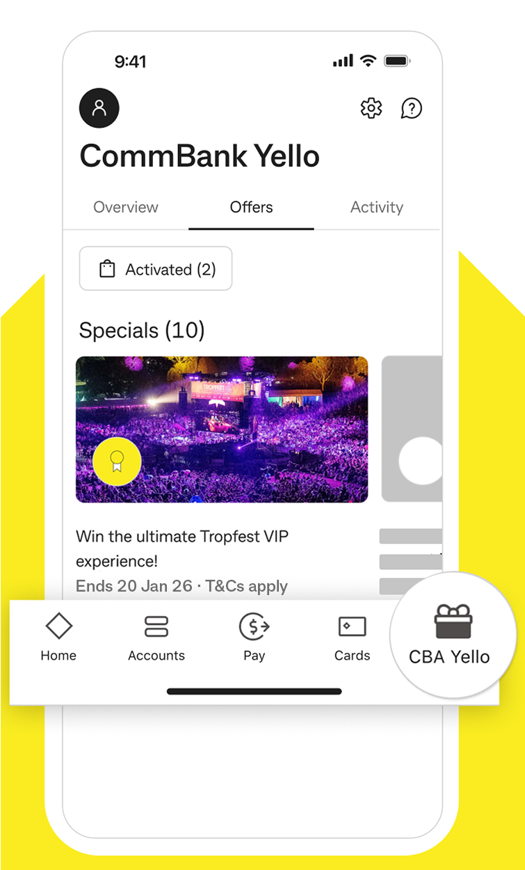 Ongoing eligibility conditions apply for CommBank Yello. See commbank.com.au/commbankyello for more information and the full terms and conditions. To opt out of CommBank Yello and stop receiving benefits, you can message us in the CommBank app by visiting commbank.com.au/messageus or visit your local branch (this won't opt you out of marketing or out of CommBank Yello for Business).