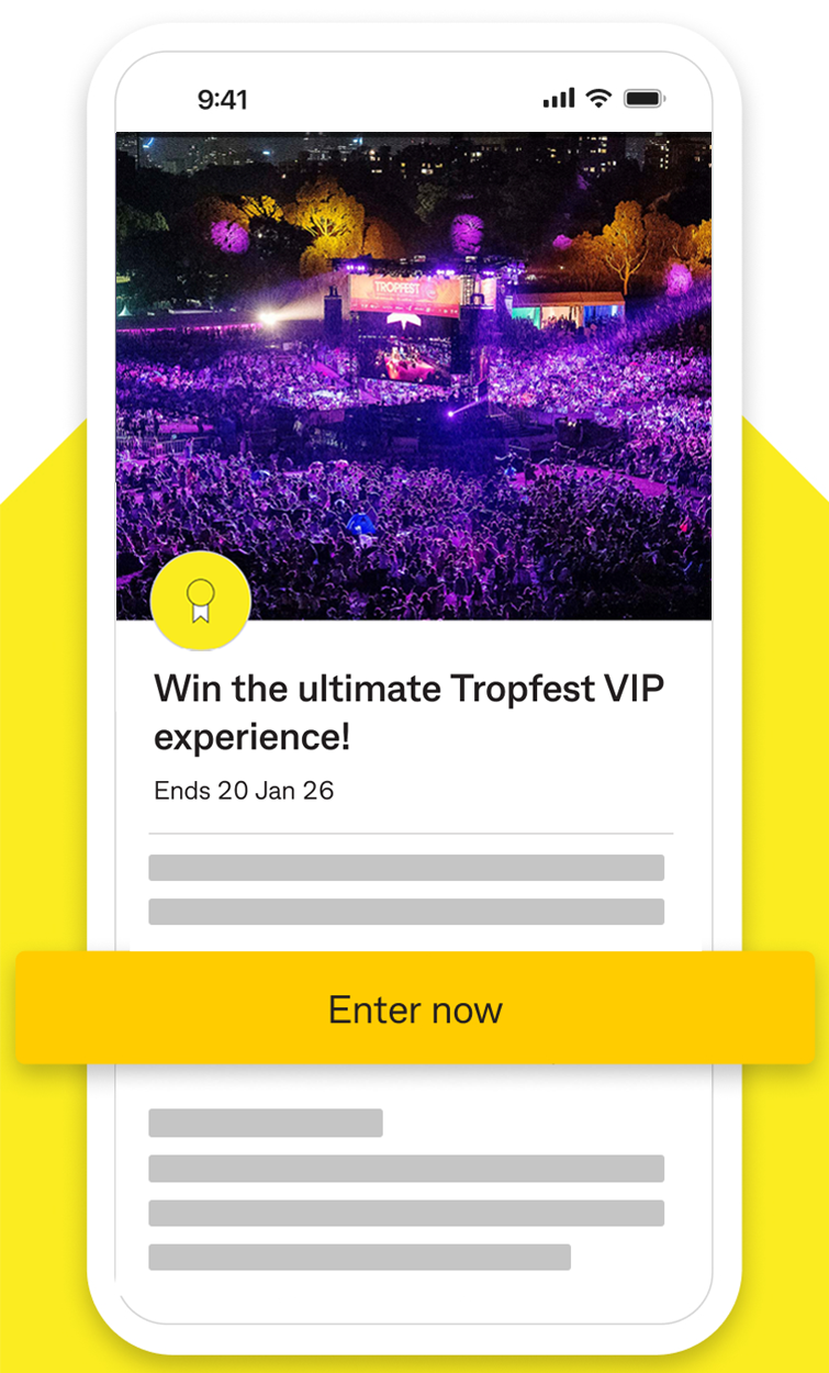 'CommBank Yello Tropfest 2026 Competition' (Promotion) is conducted by Commonwealth Bank of Australia (Promoter) and runs from 2:00pm (AEDT) on 9th December 2025 to 3:00pm (AEDT) on 20th January 2026 (Promotion Period) (see full terms and conditions here commbank.com.au/tropfest2026competition). Open to individuals who are 18 years or over, reside in Australia, are eligible to participate in CommBank Yello program (see commbank.com.au/commbankyellotcs) (and have not become ineligible or opted out during the Promotion Period), meet the eligibility criteria for either the 'CommBank Yello Plus', 'CommBank Yello Gold' or 'CommBank Yello Diamond' tiers as set out in the CommBank Yello Terms and Conditions, have downloaded and/or logged into CommBank app during the Promotion Period, have a correct email address recorded with the Promoter and are not involved in the Promotion or management of the Promoter or any other benefitting organisation. Entry through the CommBank app during Promotion Period. Max 1 entry per person. First eligible entry randomly drawn will win return economy class flights for 2 people to Sydney from the Winner’s nearest airport (up to the value of $3,000.00 depending on location of the nearest airport); return airport private car transfer for 2 people from Sydney domestic airport to Ace Hotel at 47 – 53 Wentworth Ave, Sydney NSW 2000 (valued at $340.00); 2 x nights of accommodation for 2 people with a breakfast allowance at the Ace Hotel (valued at $1,000.00); Dinner at Pellegrino 2000 for 2 people (valued at $300.00); 2 x VIP passes to Tropfest on 22nd February 2026 at Centennial Park, Sydney (valued at $500); Opportunity for 2 people to meet a Tropfest Judge (valued at $2,000.00) (together, the Prize). Total prize value: $7,140.00. Random electronic prize draw conducted at 11:00am (AEDT) on 22nd January 2026 at Trade Promotions and Lotteries Pty Ltd (ACN 601 297 330), Level 2, 11 York St, Sydney NSW 2000. Winner notified by email on 23rd January 2026. Winner's first initial, last name and postcode will be published on the Promoter's website on 23rd January 2026. Travel period is expected to be between 21st February 2026 and 23rd February 2026 (Travel Period) but may be subject to change. Once confirmed, the exact Travel Period will be notified to the winner as soon as possible. The winner must be able to take the Prize in the confirmed Travel Period or will forfeit the Prize. If the Prize is unclaimed or cannot be delivered to or accepted by the winner by 2:00pm (AEDT) on 6th February 2026 it will be forfeited and awarded to a reserve winner. Permits: ACT Permit No. ACT TP25/02966 and SA Licence No. T25/2250.