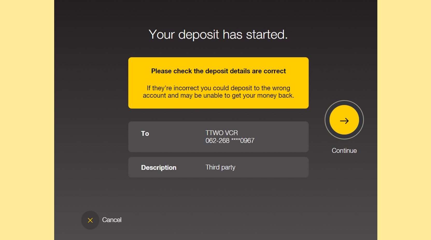 If you are depositing into another individual’s CommBank account, the deposit cannot be completed at the ATM if the recipient’s account is not eligible to receive QR Cardless deposits.