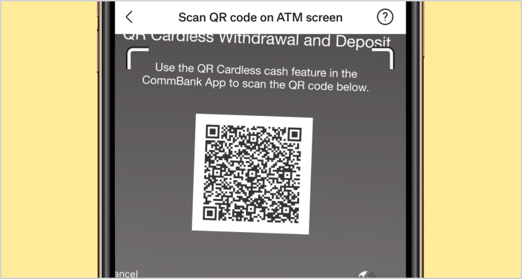 2. After starting your transaction in the CommBank app, use the QR code scanner to scan the code displayed on the ATM screen
