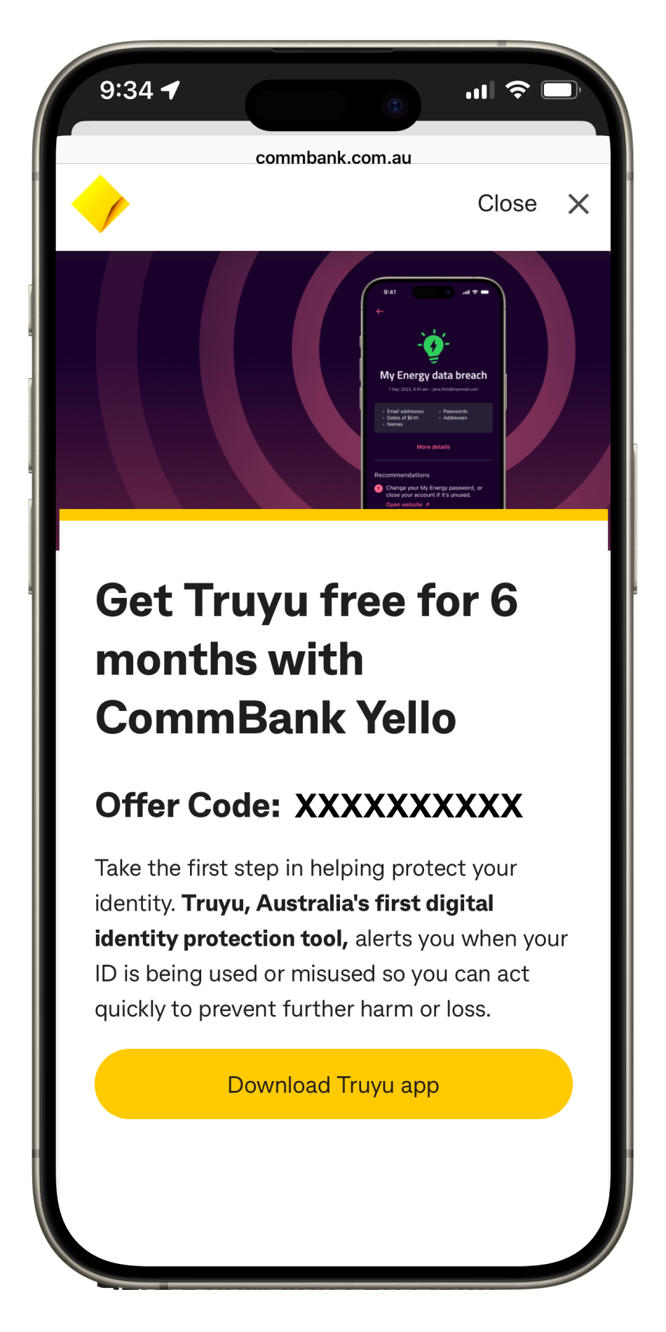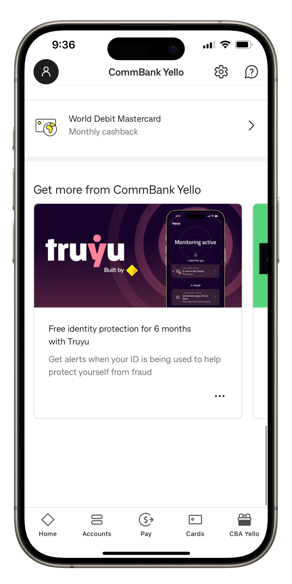 ^^CommBank Yello is a customer recognition program offered by Commonwealth Bank of Australia ABN 48 123 123 124 AFSL 234945. Eligibility conditions apply, see commbank.com.au/commbankyello for full terms and conditions. Offers may vary at any time. Full T&Cs and details on how to activate the offer at truyu.com.au/terms-and-conditions. After the 6-month free subscription expires, users will be charged $4.99/month in accordance with the Truyu App Terms and Conditions. Truyu and CommBank reserve the right to vary, update or remove this offer at any time.