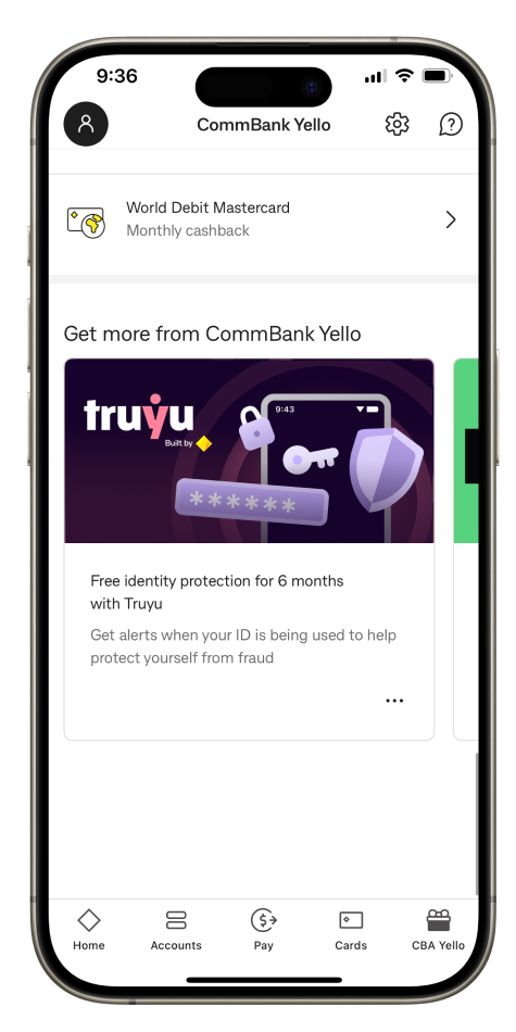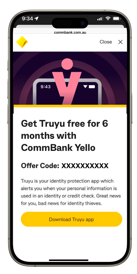 ^^ CommBank Yello is a customer recognition program offered by Commonwealth Bank of Australia ABN 48 123 123 124 AFSL 234945. Eligibility conditions apply, see commbank.com.au/commbankyello for full terms and conditions. Offers may vary at any time. Full T&Cs and details on how to activate the offer at truyu.com.au/terms-and-conditions. After the 6-month free subscription expires, users will be charged $4.99/month in accordance with the Truyu App Terms and Conditions. Truyu and CommBank reserve the right to vary, update or remove this offer at any time.