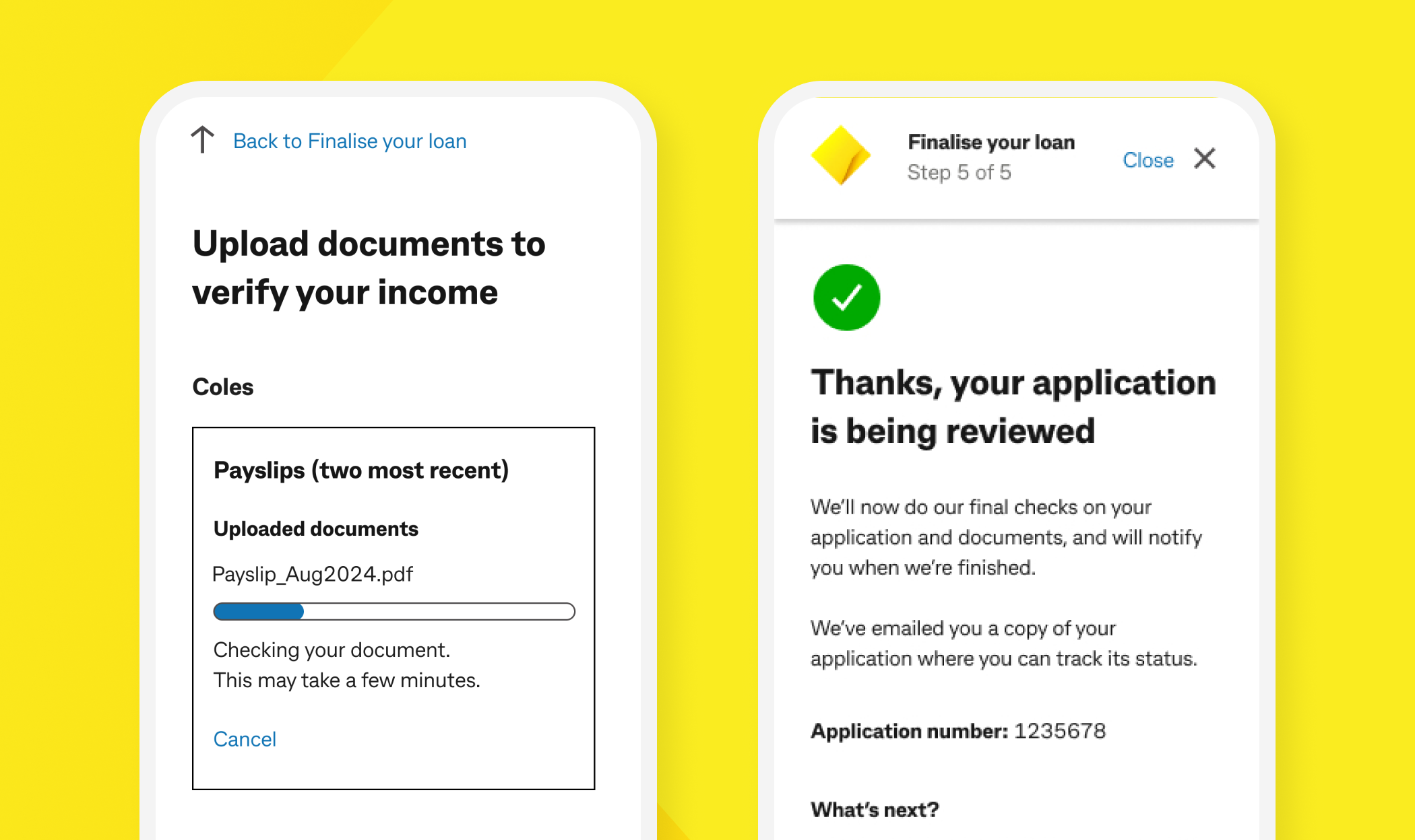 We’ll show your outcome on the decision screen in the CommBank app. To view it, search ‘Manage my applications’. The application status will be displayed as declined or unsuccessful.