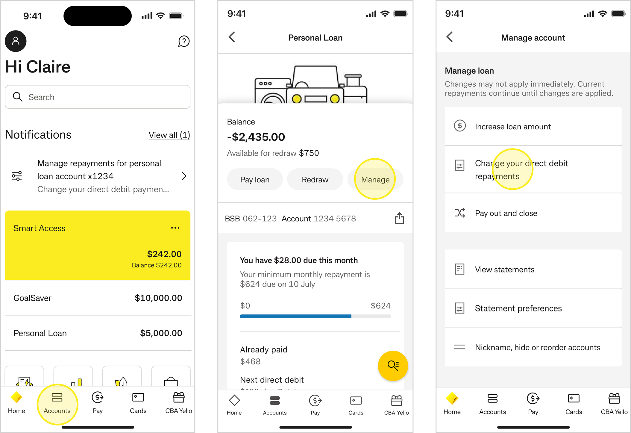 Select Change direct debit repayments