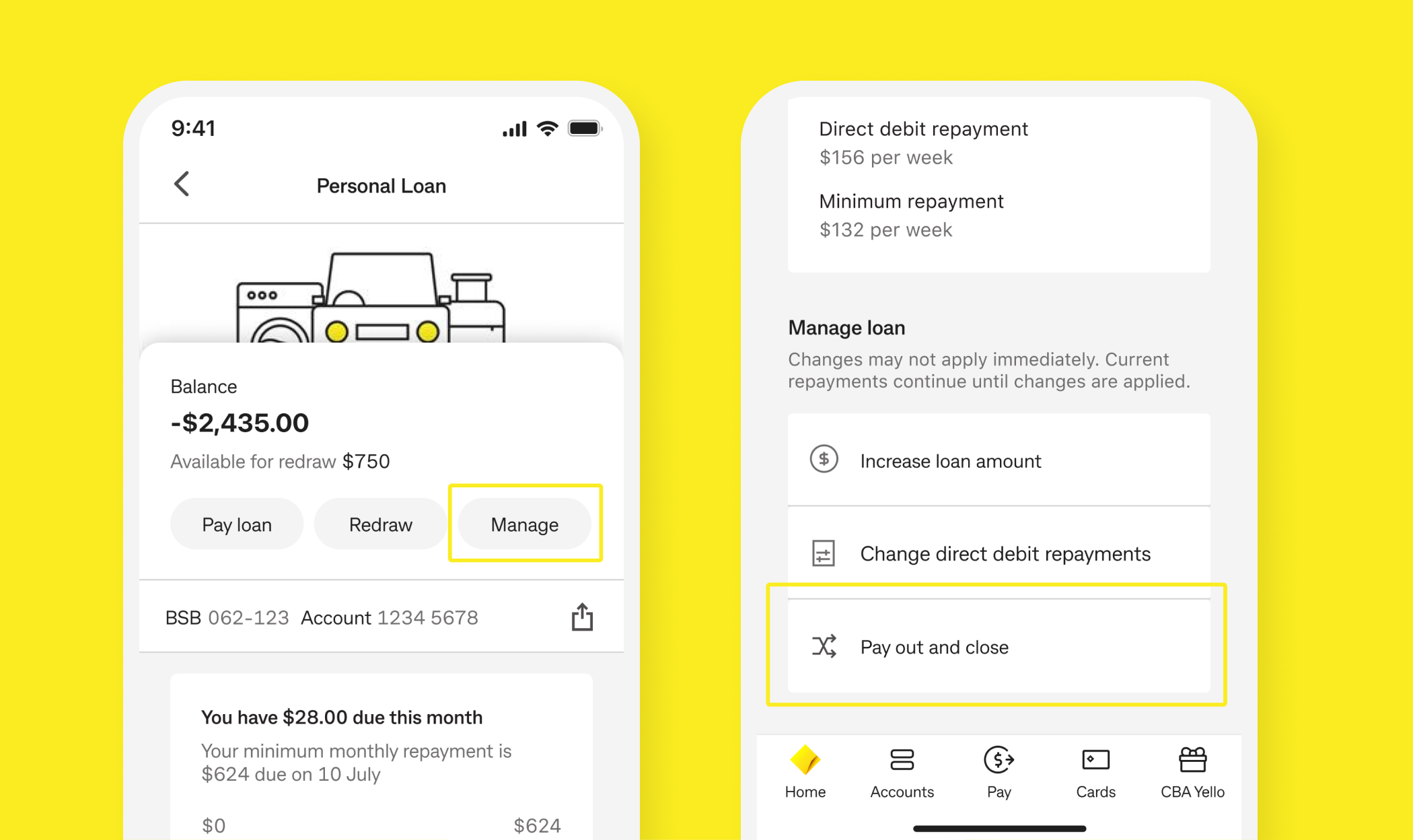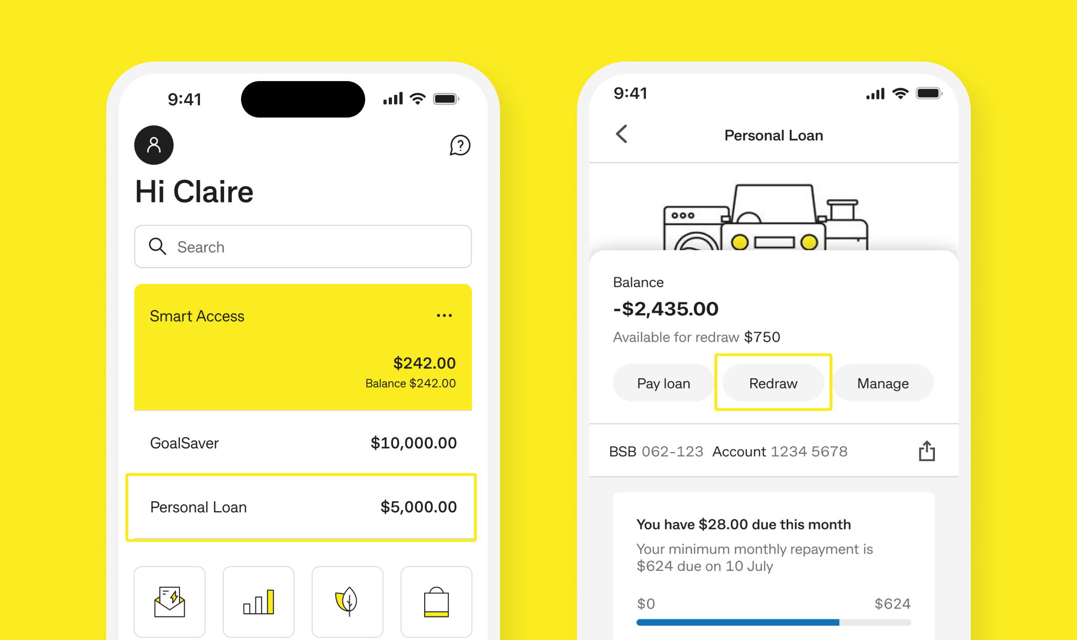 You can check your available redraw balance at any time in the CommBank App or NetBank under your Personal Loan’s ‘Available funds’.