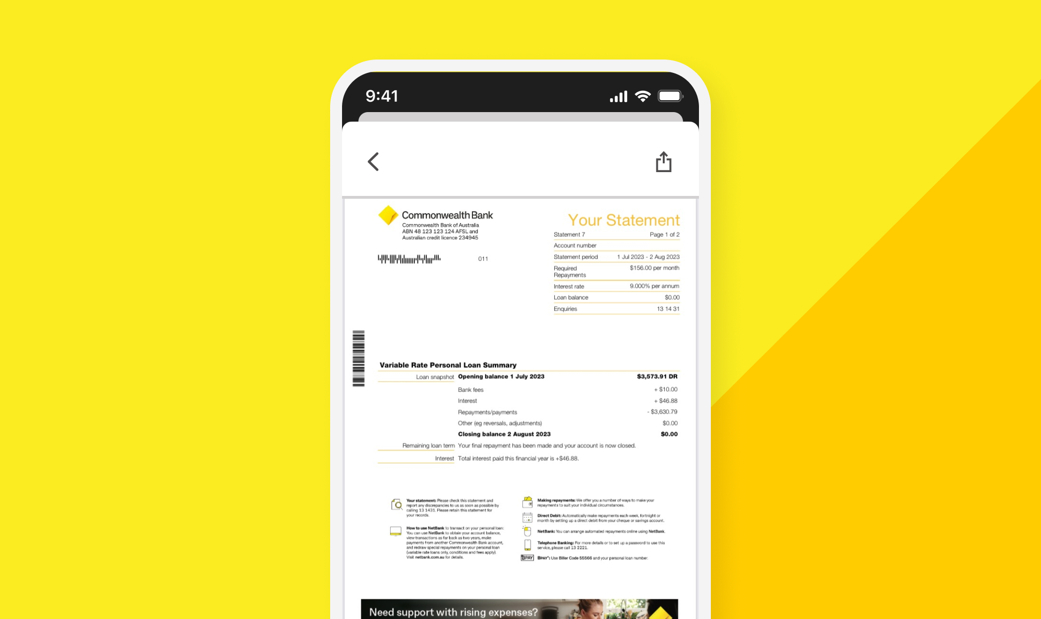 If you’re struggling to make your loan repayments, or think you may fall behind, please reach out to our Financial hardship team by messaging us in the CommBank app or request financial assistance in NetBank.