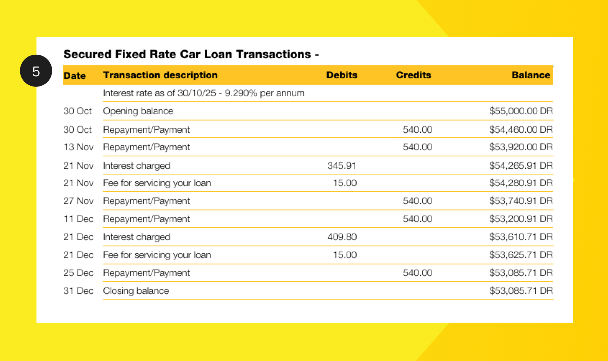 5. Transactions - Shows all transactions on your loan account during the statement period, listed in date order.