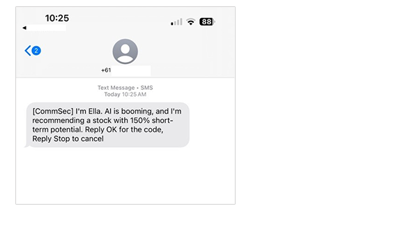 We are aware that scammers are sending text messages pretending to be from CommSec, often claiming to have an exclusive stock tip or investment opportunity with promises of high returns. These messages will try to get you to engage — whether it’s by replying, clicking a link, or showing interest in the offer. Once you respond, the scammer will quickly move the conversation to another messaging platform, posing as a so-called “advisor” or “analyst”.