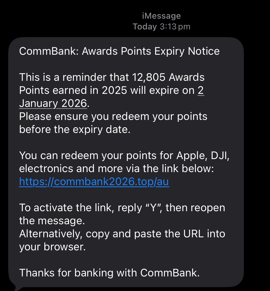 A fraudulent SMS is currently circulating, attempting to deceive customers into redeeming CommBank Rewards points. These messages may prompt recipients to click on suspicious links, replying to a message to activate a link, or share sensitive details—including banking credentials.