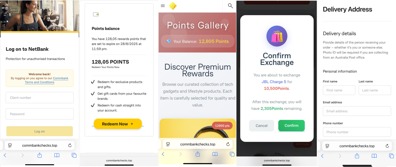The phishing attempts are crafted to appear authentic and exploit the sense of urgency associated with the potential loss of CommBank Awards. When a recipient clicks on the malicious link, they are redirected to a fraudulent CommBank NetBank login page hosted at commbankchecks[dot]top and other domains that look similar. If the user proceeds to login, the site displays a “Points Balance” and prompts them to select “Redeem Now.” This action leads to another page showcasing a selection of products.
